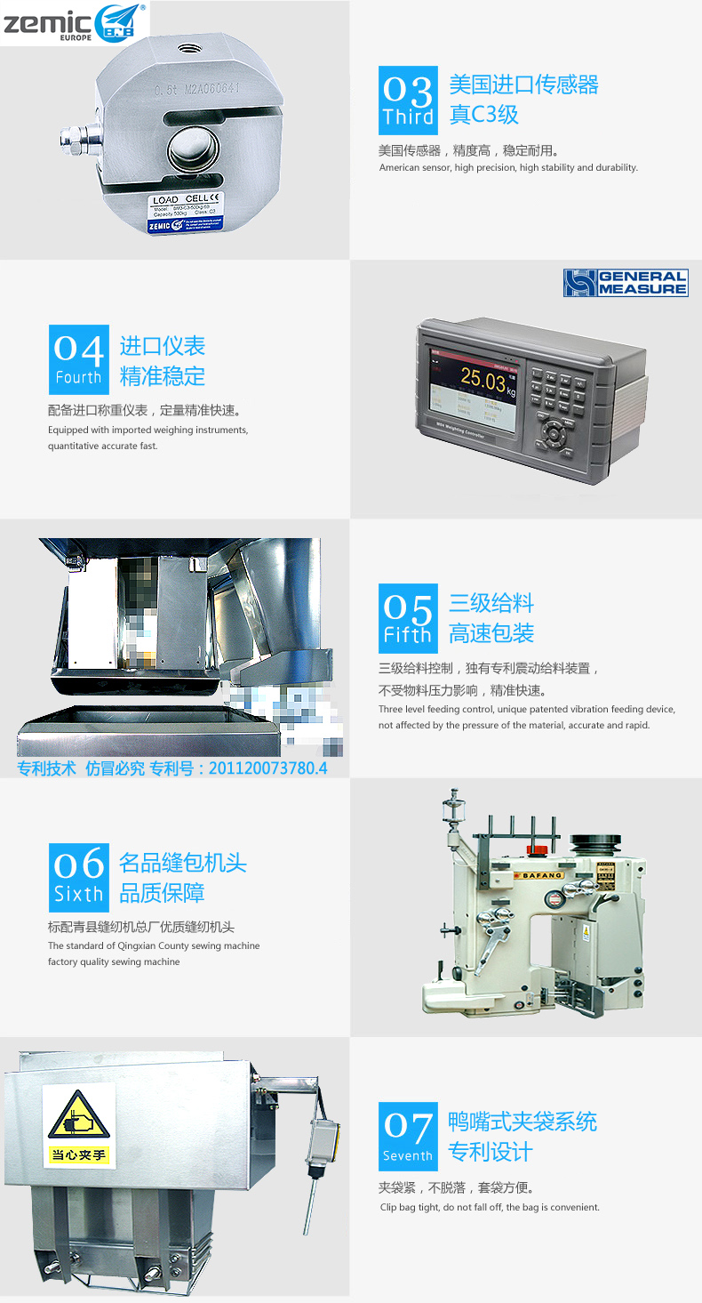 七、夾袋系統(tǒng)好,東昌定量秤的專利夾袋系統(tǒng)為張緊式結構,包裝任何物料,均能夠快速的完成夾袋過程,并且可以保證裝多么重的物料也不會造成滑落。